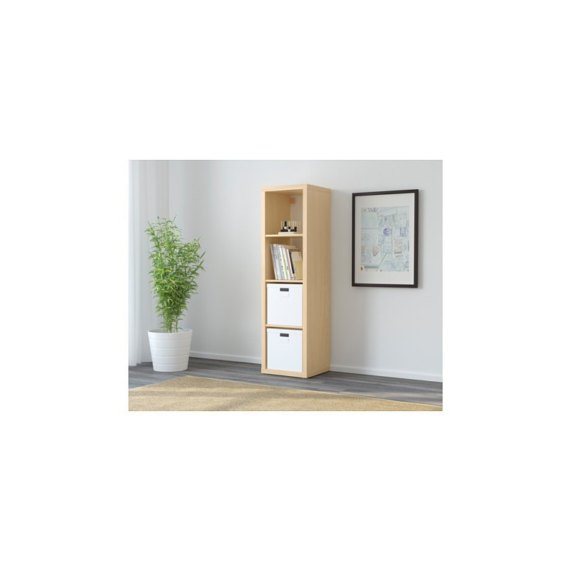 کتابخانه KALLAX یک قفسهی مستطیلی ایستاده با پهنای کم است که درعین سادگی در چیدمان مدرن بسیار زیبا به نظر میرسد. ارتفاع کتابخانه 147 سانتیمتر، عرضش 42 سانتیمتر و عمق آن 39 سانتیمتر است و برای قرار دادن در دو طرف میز تلویزیون، کنج دیوار، کنار تختخواب و … مناسب است. فاصلهی هر 4 طبقهی این کتابخانه مساوی است و از نئوپان ساخته شده که در انتها با روکش ملامینه پوشش داده شده است. این کتابخانه بدون استفاده از میخ و پیچهای روکار با قابلیت مونتاژ در خانه و در بستهبندی مقوایی عرضه شده است. نحوهی سرهمبندی آن با توجه به کاتالوگ داخل جعبه آسان است. این کتابخانه ایستاده درسه رنگ قهوه ای سوخته، سفید و خودرنگ موجود است که بنا به رنگ سایر چیدمان خانه میتوان رنگ مناسب را انتخاب کرد.
